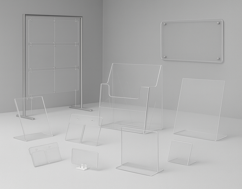 Totems, enseignes lumineuses, panneaux, vitrines, banderoles, véhicules, objets publicitaires, textiles, plexiglas, lettrages adhésifs, ainsi que plaques gravées et industrielles.